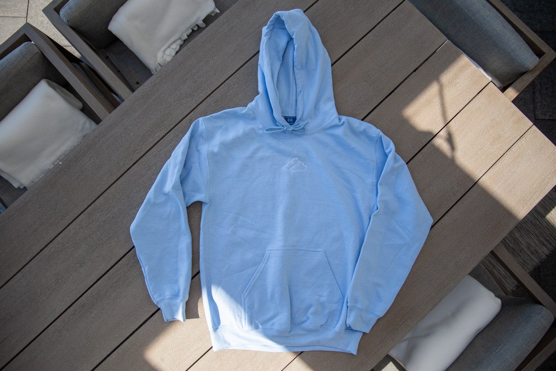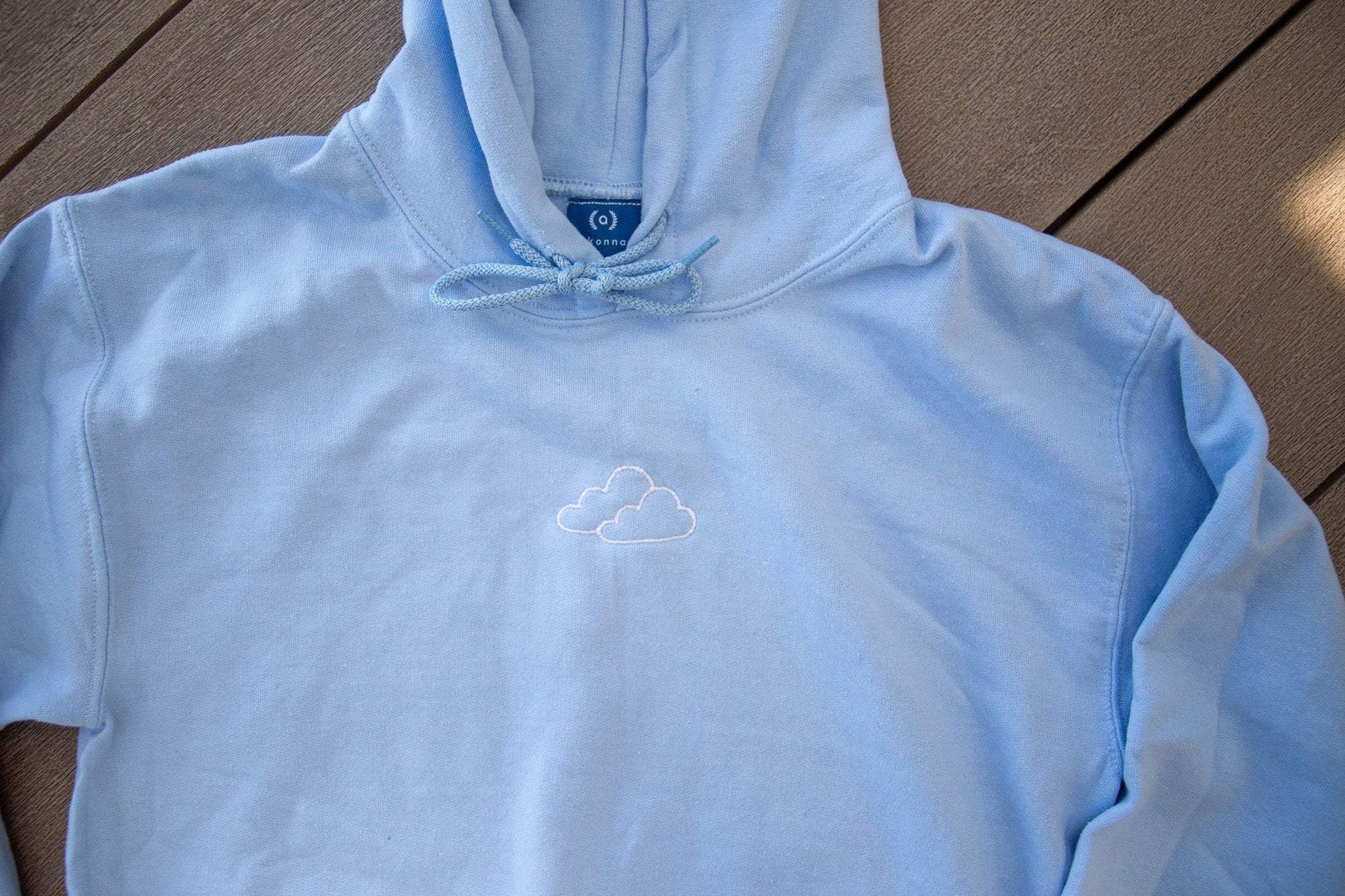 An embroidered cloud hoodie that comes in blue, white, black and beige!