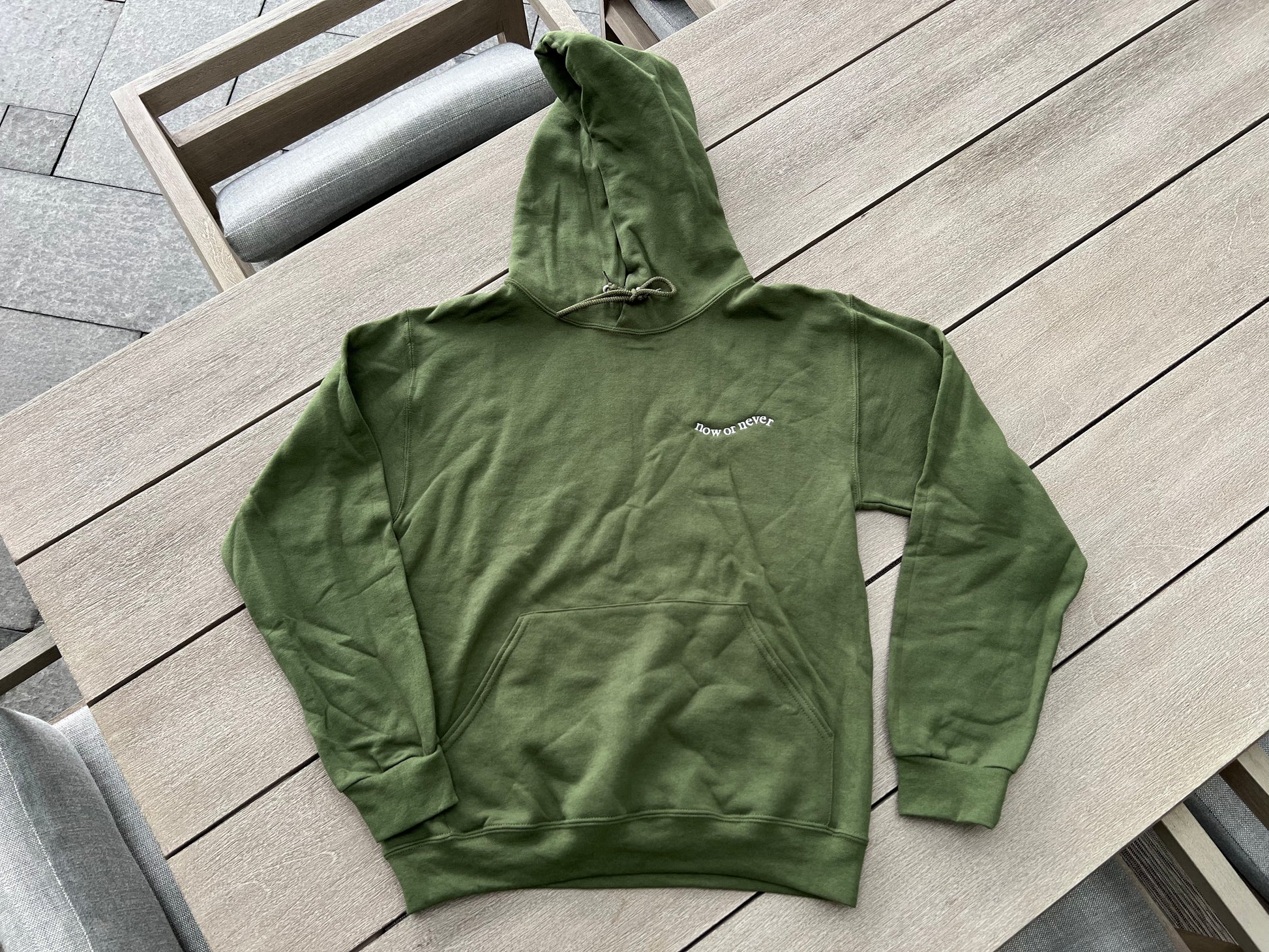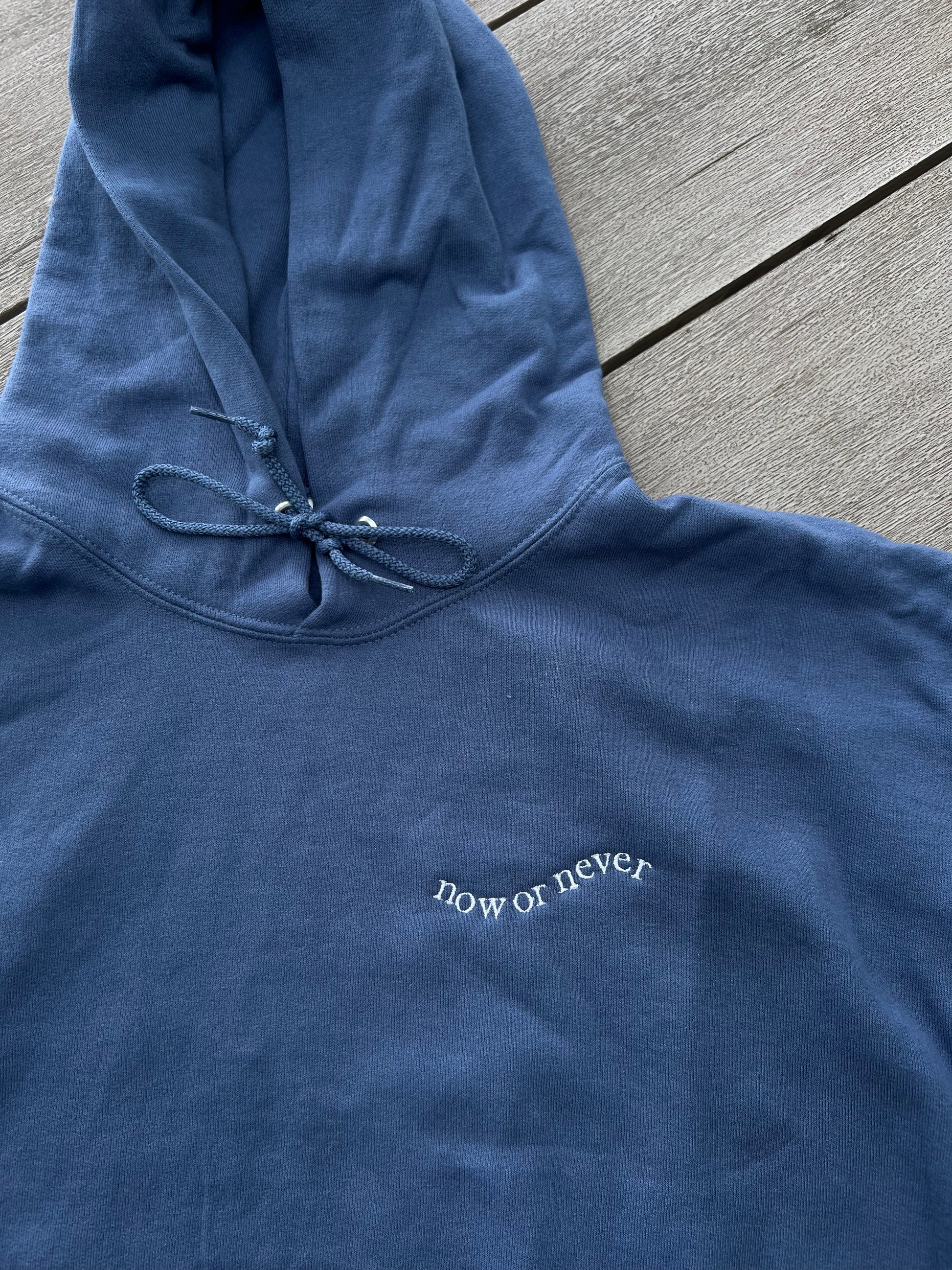 An embroidered 'Now or Never' hoodie to remind you to stop waiting for the right time!
