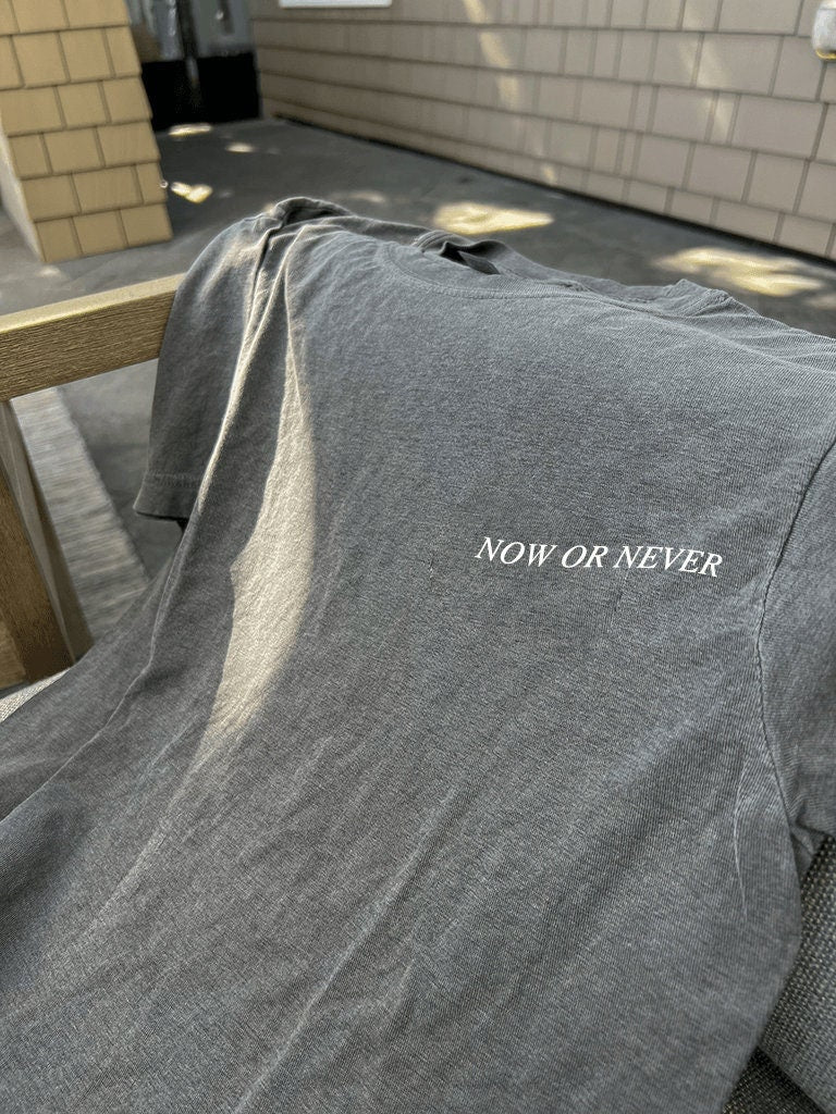 A 'now or never' shirt to remind you to stop waiting for the right time. This vintage dyed shirt is the perfect graphic tee for the summer.